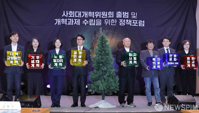 [서울=뉴스핌] 윤창빈 기자 = 김민석 국무총리를 비롯한 정당, 시민사회 단체 참석자들이 15일 서울 여의도 국회 박물관에서 열린 사회대개혁위원회 출범 및 개혁과제 수립을 위한 정책포럼에서 기념 퍼포먼스를 하고 있다. 2025.12.15 pangbin@newspim.com