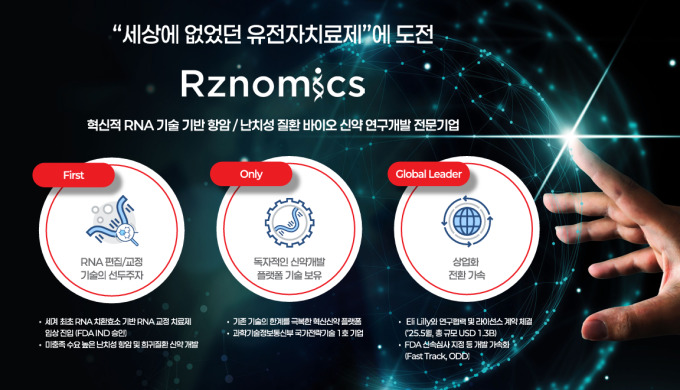 알지노믹스는 이같은 기술력을 토대로 미충족 의료 수요가 높은 암과 희귀·난치성 질환을 적응증으로 하는 혁신 치료제를 개발하고 있다. 주요 파이프라인인 'RZ-001'은 간암과 교모세포종을 타깃으로 한 항암유전자 치료제로 미국 식품의약국(FDA) 희귀의약품(ODD) 지정을 받았다. 현재 적응증 확대를 위한 임상을 진행하고 있다.