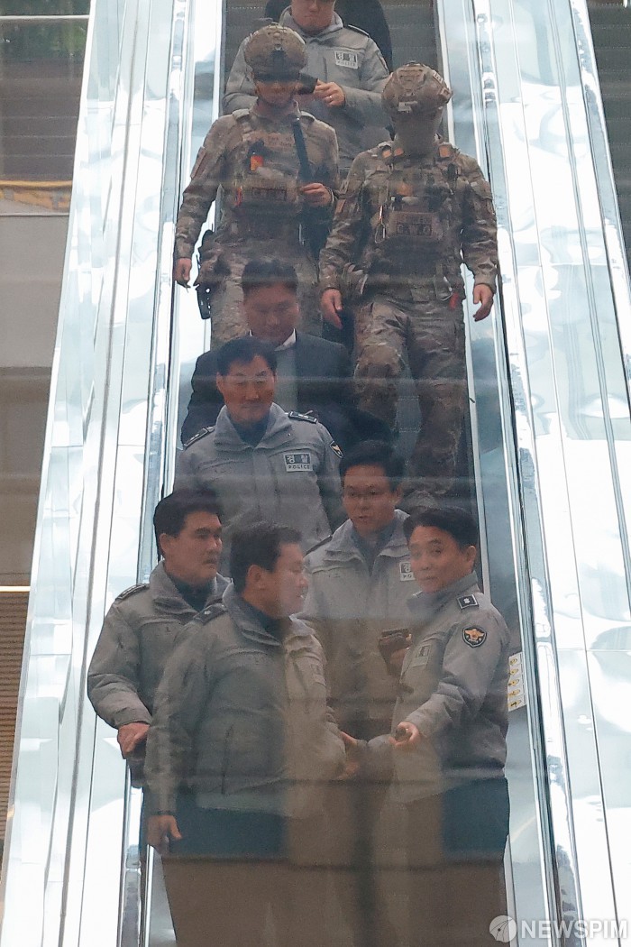 [성남=뉴스핌] 류기찬 기자 = 15일 오후 경기 성남시 분당구 카카오 판교 사옥에 폭발물이 설치됐다는 협박 신고가 접수된 가운데 경찰 관계자들과 공군 폭발물처리반이 수색을 마친 뒤 건물을 나서고 있다. 2025.12.15 ryuchan0925@newspim.com