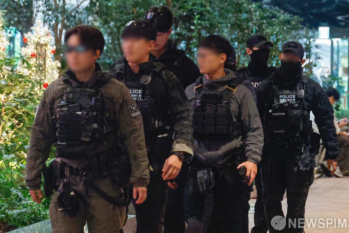 [성남=뉴스핌] 류기찬 기자 = 15일 오후 경기 성남시 분당구 카카오 판교 사옥에 폭발물이 설치됐다는 협박 신고가 접수된 가운데 경찰 특공대가 수색을 벌이고 있다. 2025.12.15 ryuchan0925@newspim.com