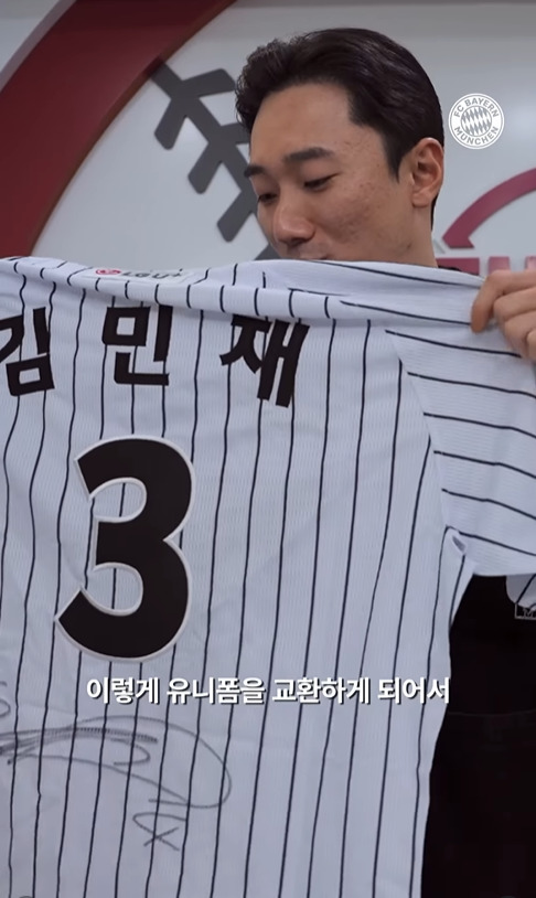 뮌헨은 15일 구단 SNS에 '민재가 민재에게'라는 제목의 영상을 공개하며, 잠실구장을 직접 찾아 신민재에게 김민재 사인 유니폼이 들어 있는 상자를 건넸다. 유니폼에는 김민재의 등번호 3번과 영문 이름 'MINJAE'가 새겨져 있었다. 신민재는 "정말 감사합니다"라며 즉석에서 유니폼을 입고 기념 촬영을 했다.​