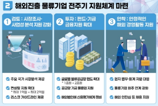 투자 단계에서는 기업의 자금 조달 어려움을 해소하기 위해 해양진흥공사가 운용하는 '글로벌 물류공급망 투자펀드'의 한도를 1조원에서 2조원으로 확대하고, 추가로 1조원 중 3천억원 규모는 중소·중견 물류기업의 해외투자를 전담하기 위한 투자처 미특정 기금(블라인드 펀드)으로 조성한다.