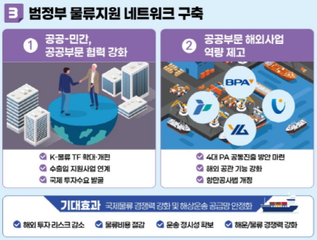 정부는 공공기관(해양진흥공사, 항만공사, 산업은행, 수출입은행, KOTRA)과, 물류기업 등이 분기별로 참여하는 "K-물류 협의체(TF)"를 상시 운영체계로 개편한다.