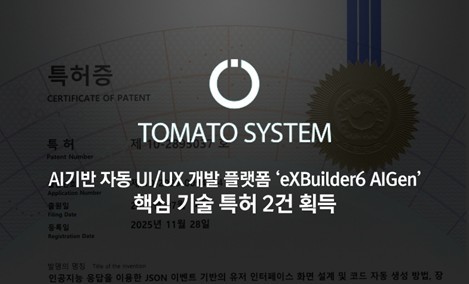 [서울=뉴스핌] 이나영 기자= 인공지능(AI) 소프트웨어 및 디지털 헬스케어 전문기업 토마토시스템은 자사의 AI 기반 UI/UX 개발 솔루션 '엑스빌더6 아이젠(eXBuilder6 AIGen)'에 적용된 핵심 기술 관련 특허 2건을 신규 등록했다고 16일 밝혔다.