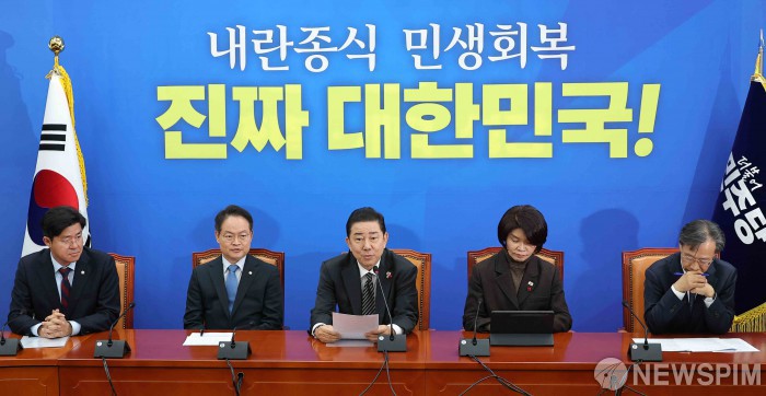 [서울=뉴스핌] 윤창빈 기자 = 김병기 더불어민주당 원내대표가 16일 서울 여의도 국회에서 열린 원내대책회의에서 모두발언을 하고 있다. 2025.12.16 pangbin@newspim.com