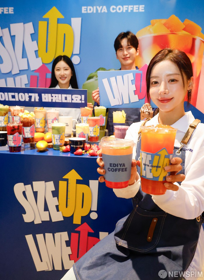 [서울=뉴스핌] 류기찬 기자 = 이디야커피가 16일 서울 중구 소재 이디야커피 매장에서 'SIZE UP & LINE UP' 음료 용량 확대 및 메뉴 라인업 개편을 알리고 있다. 이디야커피는 기존 14온스로 제공되던 모든 음료의 기본 용량을 18온스로 확대하고, 단일 사이즈로 제공되던 플랫치노, 쉐이크 메뉴에 엑스트라(EX) 사이즈를 새롭게 도입했다. 2025.12.16 ryuchan0925@newspim.com
