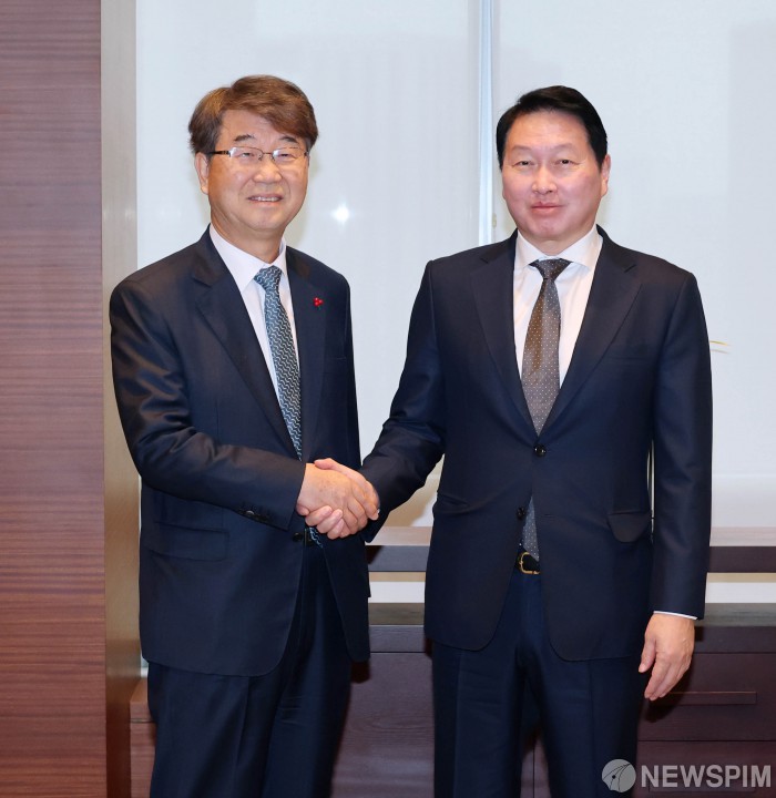 [서울=뉴스핌] 최태원 대한상공회의소 회장과(오른쪽)과 김지형 경제사회노동위원회 위원장이 16일 서울 중구 대한상의에서 만나 악수를 하고 있다. [사진=대한상공회의소] 2025.12.16 photo@newspim.com