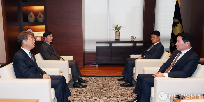 [서울=뉴스핌] 최태원 대한상공회의소 회장과(오른쪽)과 김지형 경제사회노동위원회 위원장이 16일 서울 중구 대한상의에서 면담을 하고 있다. [사진=대한상공회의소] 2025.12.16 photo@newspim.com