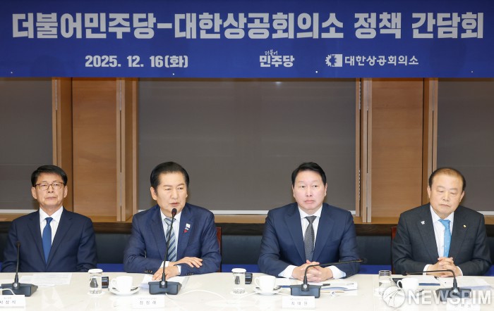 [서울=뉴스핌] 류기찬 기자 = 정청래 더불어민주당 대표가 16일 오전 서울 중구 대한상공회의소에 열린 ‘더불어민주당-대한상공회의소 정책간담회’에서 인사말을 하고 있다. 2025.12.16 ryuchan0925@newspim.com