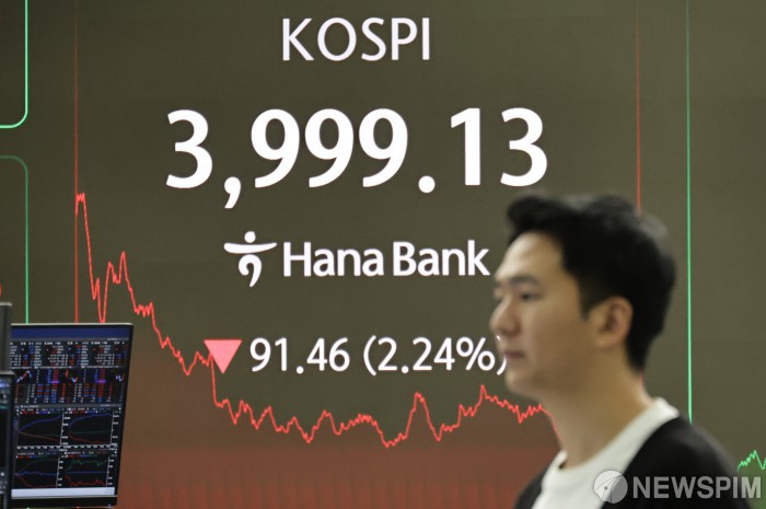[서울=뉴스핌] 양윤모 기자 = 인공지능(AI) 거품론 및 미국 고용지표 발표에 대한 경계감으로 16일 오후 코스피가 전장 종가보다 91.46 포인트(2.24%) 하락하며 3999.13로, 코스닥은 22.72 포인트(2.42%) 하락한 916.11로 장을 마감한 가운데, 서울 중구 하나은행 딜링룸에서 직원들이 업무를 보고 있다. 서울외환시장에서 달러/원 환율은 전장 대비 5.90원 상승한 1476.90원에 주간거래를 마감했다. 2025.12.16 yym58@newspim.com