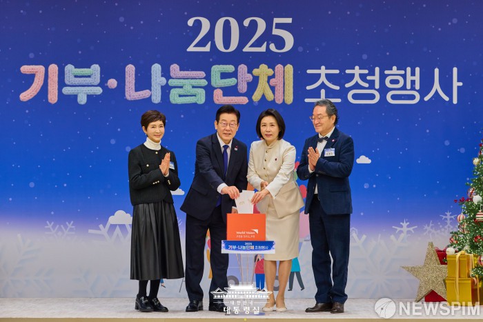 [서울=뉴스핌] 이재명 대통령과 김혜경 여사가 16일 서울 용산 대통령실에서 열린 2025년 기부·나눔단체 초청행사에서 월드비전에 성금을 전달하고 있다. [사진=대통령실] 2025.12.16 photo@newspim.com