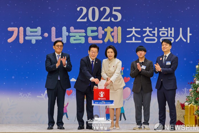 [서울=뉴스핌] 이재명 대통령과 김혜경 여사가 16일 서울 용산 대통령실에서 열린 2025년 기부·나눔단체 초청행사에서 세이브더칠드런에 성금을 전달하고 있다. [사진=대통령실] 2025.12.16 photo@newspim.com
