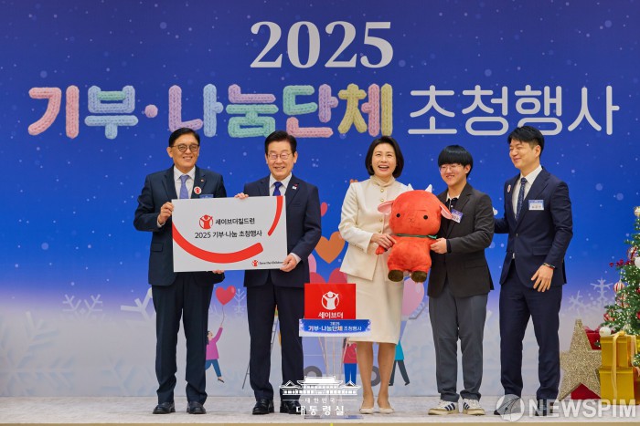 [서울=뉴스핌] 이재명 대통령과 김혜경 여사가 16일 서울 용산 대통령실에서 열린 2025년 기부·나눔단체 초청행사에서 세이브더칠드런에 성금 전달후 기념촬영을 하고 있다. [사진=대통령실] 2025.12.16 photo@newspim.com