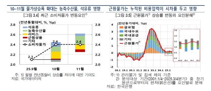 한국은행은 17일 '물가안정목표 운영상황 점검' 보고서를 통해 "소비자물가 상승률은 9월까지 목표 수준인 2% 근방에서 움직였으나, 10월 이후 농축수산물과 석유류 가격 상승 등의 영향으로 2%대 중반까지 다소 확대됐다"고 밝혔다. 10월과 11월 소비자물가 상승률은 전년 동기 대비 각각 2.4%를 기록했다.