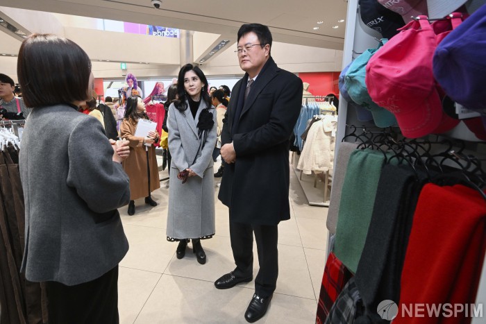 [서울=뉴스핌] 김학선 기자 = 이부진 한국방문의해위원장과 김대현 문화체육관광부 2차관이 17일 서울 명동 에잇세컨즈 매장에서 '코리아그랜드세일' 현장점검을 하고 있다. 2025.12.17 yooksa@newspim.com