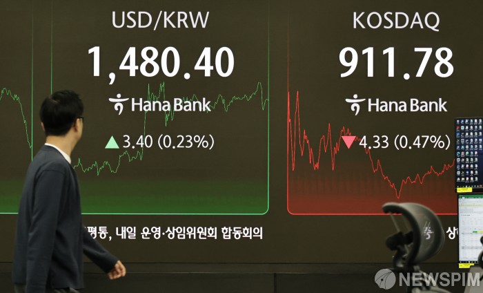 [서울=뉴스핌] 양윤모 기자 = 17일 오후 서울 외환시장에서 달러/원 환율이 전장 대비 3.40원 오른 1480.40원을 기록하며 지난 4월9일(1487.6원) 이후 8개월여 만에 가장 높은 수준을 기록한 가운데, 서울 중구 하나은행 딜링룸에서 직원들이 업무를 보고 있다. 2025.12.17 yym58@newspim.com