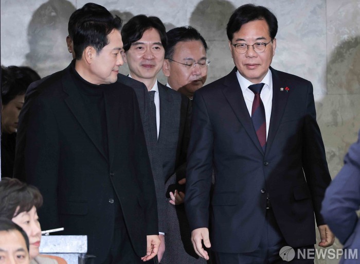 [서울=뉴스핌] 윤창빈 기자 = 장동혁 국민의힘 대표, 송언석 원내대표 등 지도부가 17일 서울 여의도 국회에서 열린 정책의원총회에 참석하고 있다. 2025.12.17 pangbin@newspim.com