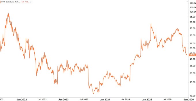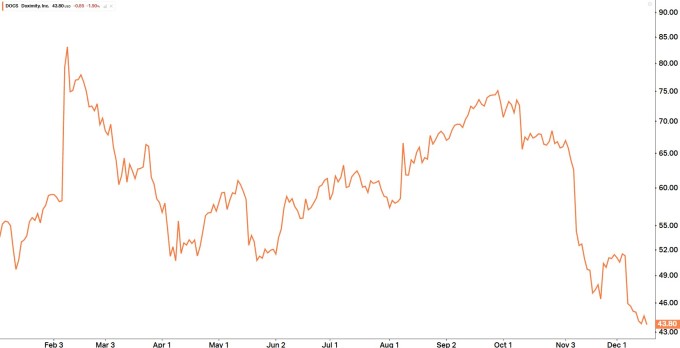 올해 독시미티 주가는 수차례 수난을 겪었다. 연초 이후 18%라는 낙폭 자체도 가볍지 않지만 그 안에는 3차례의 급락기가 있다. 2~5월의 추락, 9월 말~11월 초순의 급락, 또 11월 초순~현재까지의 하락이다. 현재가는 43.8달러(16일 종가)로 2월 연중 최고가 83달러 대비 47% 떨어져 반 토막 정도가 됐다.