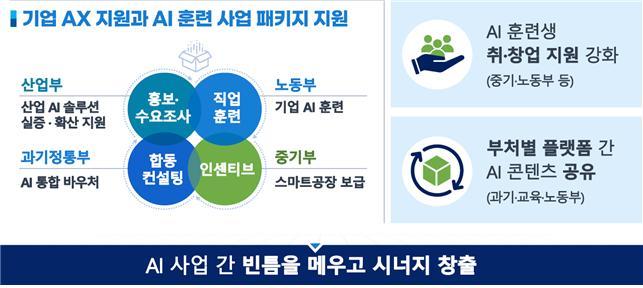 부처 간 협업도 강화해 타 부처의 AX(인공지능 전환) 사업에 참여하면 노동부의 컨설팅 등을 받을 수 있도록 한다. AI 훈련 참여자에게는 중기부의 취·창업, 사업화 지원 사업을 연계 지원한다. K-MOOC, 우리의 AI러닝 등 타 부처의 교육 플랫폼에도 STEP에 올라가는 AI 콘텐츠를 공유한다.