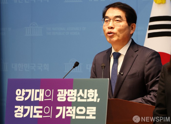 [서울=뉴스핌] 최지환 기자 = 양기대 전 더불어민주당 의원이 18일 오전 서울 여의도 국회 소통관에서 기자회견을 열고 경기도지사 출마를 선언하고 있다. 2025.12.18 choipix16@newspim.com