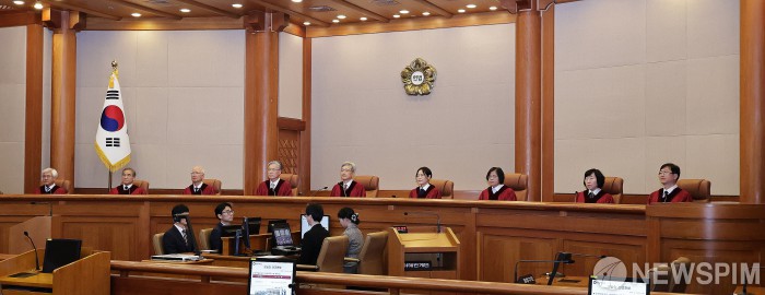 [서울=뉴스핌] 양윤모 기자 = 김상환 헌법재판소장이 18일 오후 서울 종로구 헌법재판소 대심판정에서 조지호 경찰청장의 탄핵심판 선고에서 재판관 전원일치로 파면을 인용하고 있다. 조 청장의 파면은 12·3 비상계엄 당시 국회 출입을 통제하는 등 입법부 권한을 침해하고 계엄에 가담했다는 의혹 등으로 소추된 지 371일만이다. 2025.12.18 yym58@newspim.com