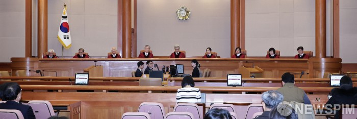 [서울=뉴스핌] 양윤모 기자 = 김상환 헌법재판소장이 18일 오후 서울 종로구 헌법재판소 대심판정에서 조지호 경찰청장의 탄핵심판 선고에서 재판관 전원일치로 파면을 인용하고 있다. 조 청장의 파면은 12·3 비상계엄 당시 국회 출입을 통제하는 등 입법부 권한을 침해하고 계엄에 가담했다는 의혹 등으로 소추된 지 371일만이다. 2025.12.18 yym58@newspim.com