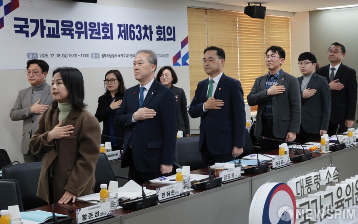 [서울=뉴스핌] 이길동 기자 =차정인 국가교육위원회 위원장이 18일 서울 종로구 정부서울청사에서 열린 국가교육위원회 제63차 회의에서 참석자들과 국기에 경례하고 있다.2025.12.18 gdlee@newspim.com