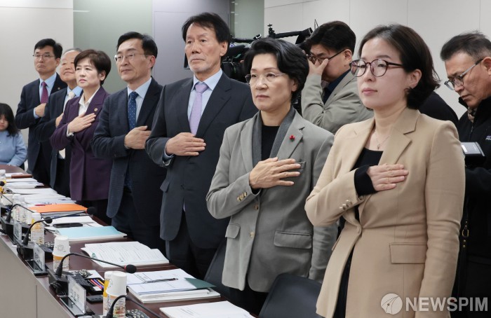 [서울=뉴스핌] 이길동 기자 =최은옥 교육부 차관(오른쪽에서 두번째) 등 참석 교육위원들이 18일 서울 종로구 정부서울청사에서 열린 국가교육위원회 제63차 회의에서 국기에 경례하고 있다.2025.12.18 gdlee@newspim.com
