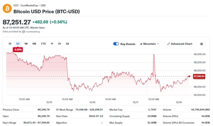 한국시간 18일 오후 8시 현재 비트코인(BTC) 가격은 24시간 전에 비해 0.78% 상승한 8만7323.45달러에 되고 있으며, 이더리움(ETH)은 2858.84달러로 2.1% 하락하고 있다. XRP, 솔라나(SOL), BNB 코인은 1~3%대 하락하는 등 주요 알트코인도 약세 흐름이다.