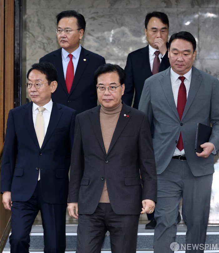 [서울=뉴스핌] 최지환 기자 = 송언석 국민의힘 원내대표가 19일 오전 서울 여의도 국회에서 열린 원내대책회의에 입장하고 있다. 2025.12.19 choipix16@newspim.com
