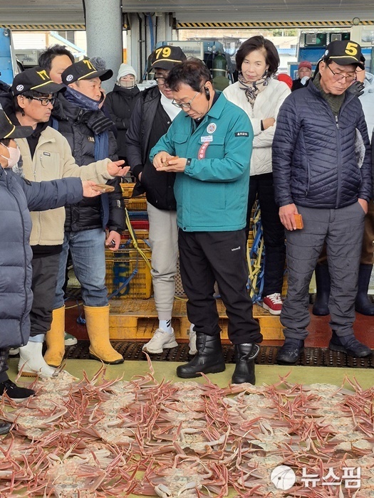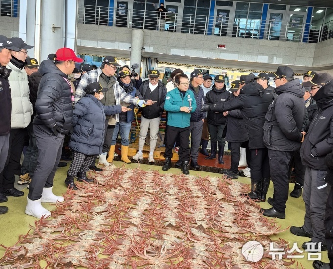 [울진=뉴스핌] 남효선 기자 = 경북 울진의 겨울 명품인 '울진대게' 조업이 본격화된 가운데 19일 오전 8시 30분, 울진죽변수협 위판장에서 손병복 울진군수가 '울진대게' 첫 입찰을 주재하며 풍어를 기원하고 있다. 이날 첫 입찰에서 '울진대게'는 마리당 1만 5700원에 위판됐다. 이는 지난해 첫 입찰 가격 7000~8000원 규모에 비해 2배를 훨씬 넘는 위판가이다. 손 군수는 이날 첫 위판에 참여한 A조 팀 공개 입찰을 주재하며 "울진대게 풍어와 어업인들의 안전"을 기원했다. 울진대게 공개 위판은 울진죽변수협 소속 자망, 근해어선을 중심으로 짜여진 조(組)별로 진행되며 이날 첫 조업에는 A~D조 22척의 어선이 참여했다. 조학형 울진죽변수협장은 "올해 첫 대게 위판 결과, 수량은 지난해 첫 위판량보다 줄었으나, 위판가는 지난해보다 월등히 높게 형성됐다"며 "기후 위기에 따른 해양 생태계 변화 등으로 침체된 어업인들에게 활력을 불어넣어줄 것으로 기대된다"고 말했다. 이날 첫 위판을 시작으로 울진대게 조업은 오는 5월까지 이어질 전망이다.2025.12.19.