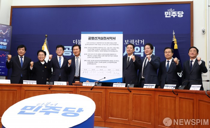 [서울=뉴스핌] 최지환 기자 = 정청래 더불어민주당 대표와 김병기 원내대표, 김정호 중앙당선관위원장 등 최고위원 후보들이 19일 서울 여의도 국회에서 열린 공명선거 실천 서약식에서 서약서를 들고 기념촬영을 하고 있다. 2025.12.19 choipix16@newspim.com