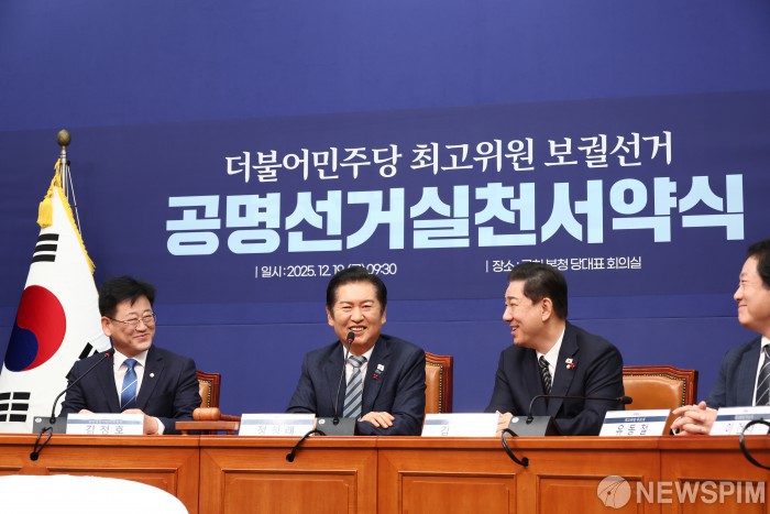[서울=뉴스핌] 최지환 기자 = 정청래 더불어민주당 대표와 김병기 원내대표, 김정호 중앙당선관위원장이 19일 서울 여의도 국회에서 열린 공명선거 실천 서약식에서 대화하고 있다. 2025.12.19 choipix16@newspim.com