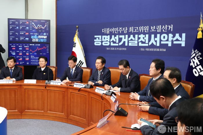 [서울=뉴스핌] 최지환 기자 = 정청래 더불어민주당 대표가 19일 오전 서울 여의도 국회에서 열린 공명선거 실천 서약식에서 발언하고 있다. 2025.12.19 choipix16@newspim.com
