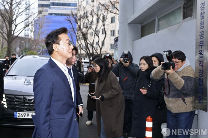 [서울=뉴스핌] 이길동 기자 = 통일교로부터 금품 수수 의혹을 받고 해양수산부 장관직을 내려놓은 전재수 더불어민주당 의원이 19일 오전 서울 서대문구 경찰청에 피의자 신분으로 출석하고 있다. 전 의원은 2018년 무렵 통일교 측으로부터 현금 2000만원과 1000만원 상당의 고가 시계를 수수한 혐의 등을 받고 있다. 2025.12.19 gdlee@newspim.com