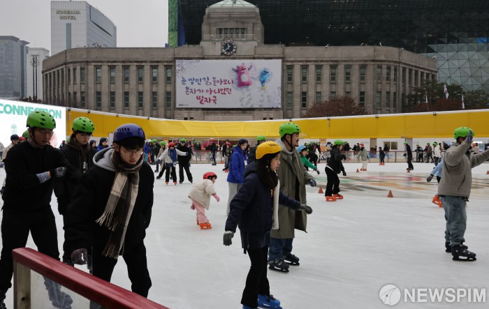 [서울=뉴스핌] 양윤모 기자 = 20일 휴일을 맞아 서울의 낮 기온이 11도를 나타내며 포근한 가운데, 서울 중구 서울광장 스케이트장에서 시민들과 관광객들이 스케이트를 즐기고 있다. 서울광장 스케이트장은 1시간에 1000원으로 헬멧과 스케이트 대여료가 포함된 가격으로 2월 8일까지 이용할수 있다. 2025.12.20 yym58@newspim.com