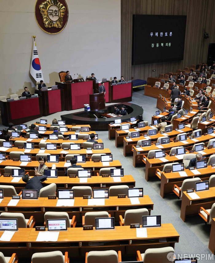 [서울=뉴스핌] 윤창빈 기자 = 장동혁 국민의힘 대표가 22일 서울 여의도 국회에서 열린 본회의에서 12·3 윤석열 비상계엄 등에 대한 전담재판부 설치 및 제보자 보호 등에 관한 특별법안(대안)에 대한 무제한 토론(필리버스터)을 시작하자 더불어민주당 의원들이 회의장을 나서고 있다. 2025.12.22 pangbin@newspim.com