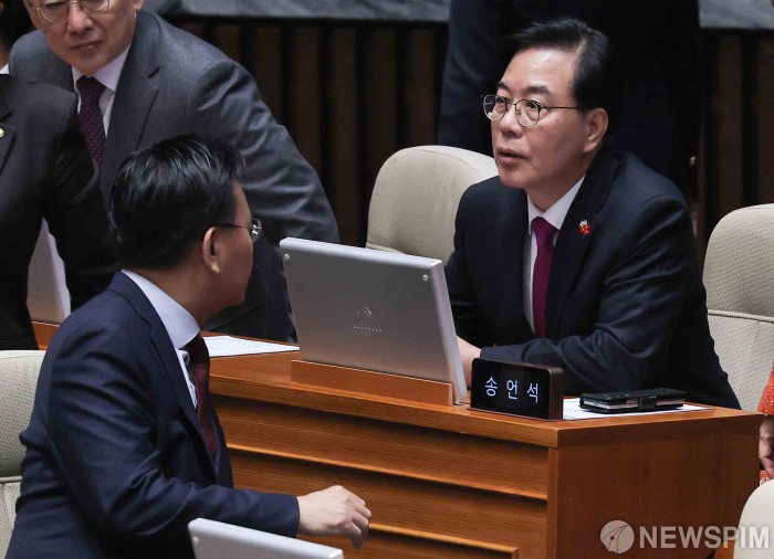 [서울=뉴스핌] 윤창빈 기자 = 송언석 국민의힘 원내대표, 유상범 원내수석부대표가 22일 서울 여의도 국회에서 열린 본회의에서 대화를 나누고 있다. 2025.12.22 pangbin@newspim.com