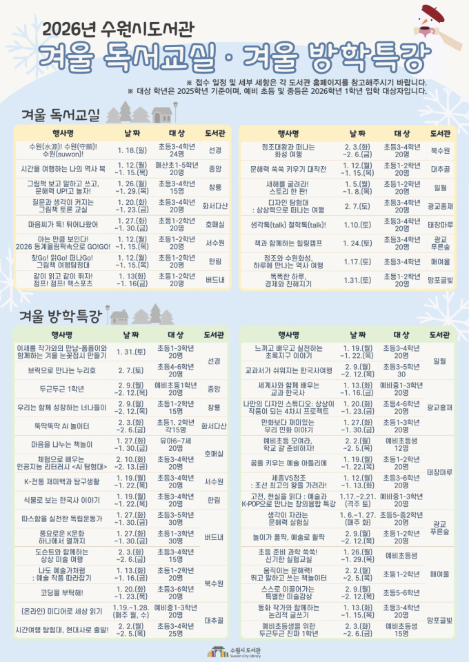 방학 기간에 도서관을 이용하며 독서 활동을 할 수 있다. 겨울독서교실은 ▲수원 역사·문화 체험▲그림책 기반 문해력 향상▲감정 이해·표현 활동▲경제·환경·철학 등 주제 독서 프로그램으로 진행한다.