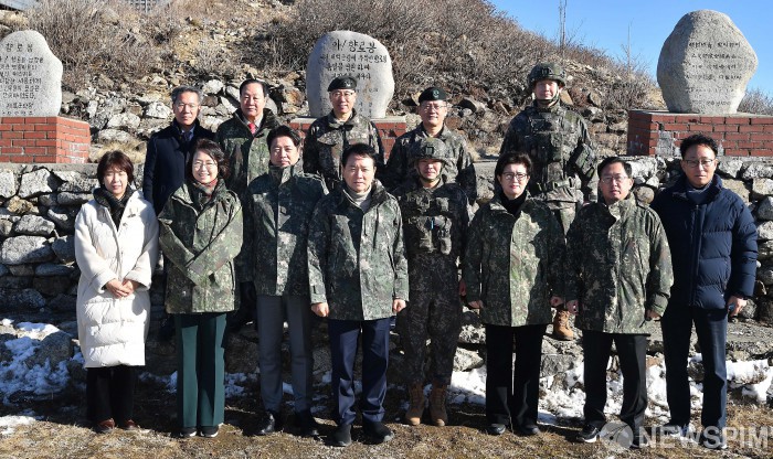 [서울=뉴스핌] 국회사진기자단 = 22일 강원 인제군 12사단 향로봉경계작전중대를 방문한 성일종 국회 국방위원장 등 국방위 의원들이 기념촬영을 하고 있다. 2025.12.22 photo@newspim.com