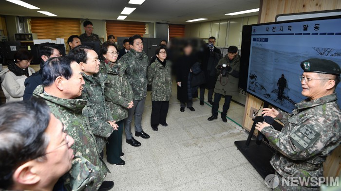 [서울=뉴스핌] 국회사진기자단 = 22일 강원 인제군 12사단 향로봉경계작전중대를 방문한 성일종 국회 국방위원장 등 국방위 의원들이 브리핑을 듣고 있다. 2025.12.22 photo@newspim.com