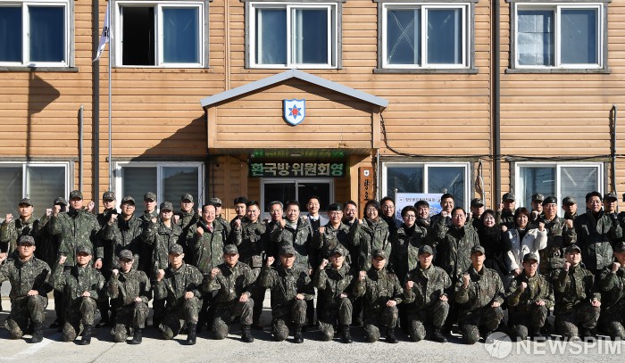 [서울=뉴스핌] 국회사진기자단 = 22일 강원 인제군 12사단 향로봉경계작전중대를 방문한 성일종 국회 국방위원장 등 국방위 의원들이 장병들과 기념촬영을 하고 있다. 2025.12.22 photo@newspim.com