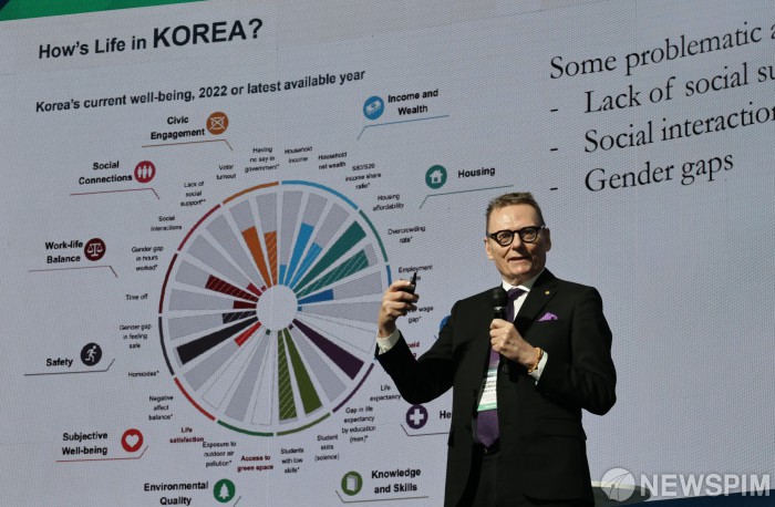[서울=뉴스핌] 양윤모 기자 = 제임스 로빈슨 교수(2024 노벨경제학상 수상자)가 23일 오전 서울 중구 DDP 아트홀에서 '미래 변화에 대응하는 새로운 소득보장제도의 구축'을 주제로 개최된 '2025 서울 국제 디딤돌소득 포럼' 행사에 참석해 기조강연을 하고 있다. 서울 국제 디딤돌소득 포럼은 서울시가 추진하는 대안적 복지모델인 서울 디딤돌소득을 중심으로, 국내외 석학과 정책 전문가들이 모여 미래 복지제도의 새로운 방향을 함께 모색하고 포용적 사회로 나아가기 위한 글로벌 논의를 이어가는 자리이다. 2025.12.23 yym58@newspim.com