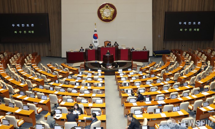 [서울=뉴스핌] 정일구 기자 = 최수진 국민의힘 의원이 23일 서울 여의도 국회에서 열린 본회의에서 정보통신망 이용촉진 및 정보보호 등에 관한 법률 일부개정법률안(대안)에 대한 무제한 토론(필리버스터)을 하고 있다. 2025.12.23 mironj19@newspim.com