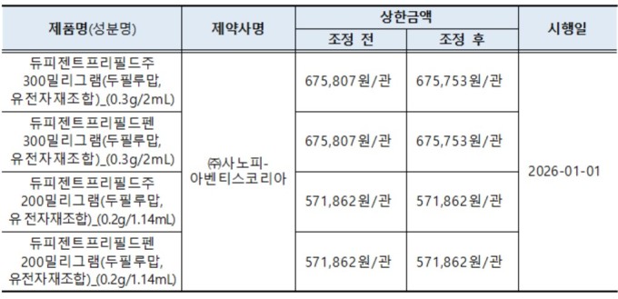 '듀피젠트주'는 만성 중증 아토피피부염에 급여 적용이 가능했으나 중증 제2형 염증성 천식에 추가로 급여 범위가 확대된다. 1인당 연간 투약비용은 약1588만원에서 476만원 수준으로 감소된다.