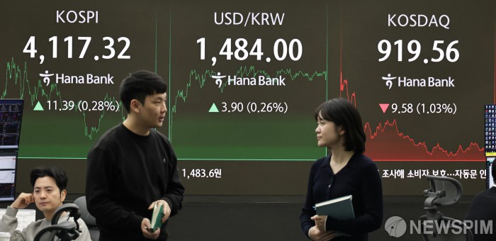 [서울=뉴스핌] 양윤모 기자 = 23일 오후 코스피가 전장 종가보다 11.39 포인트(0.28%) 상승하며 4117.32로, 코스닥은 9.58 포인트(1.03%) 하락한 919.56으로 장을 마감한 가운데, 서울 중구 하나은행 딜링룸에서 직원들이 업무를 보고 있다. 서울외환시장에서 달러/원 환율은 전장 대비 3.90원 상승한 1484.00원에 주간거래를 마감했다. 2025.12.23 yym58@newspim.com