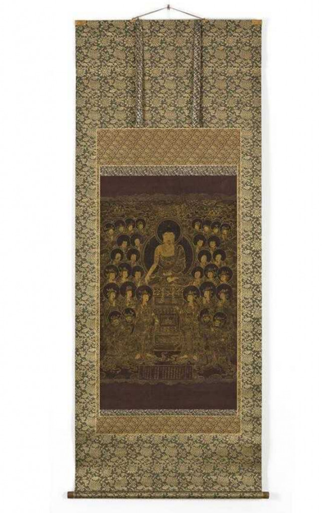 비단 바탕에 금니로 영축산에서 석가모니불이 법화경을 설법하는 순간을 표현하였는데, 화면 중앙에 크게 배치한 본존을 중심으로 6대 보살, 제석·범천, 사천왕, 팔부중 등 권속들을 짜임새 있게 배치했다.