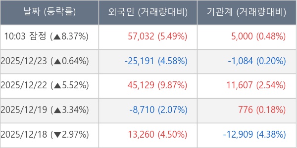 [서울=뉴스핌] 로보뉴스 = 24일 10시 15분 현재 한화비전(489790)은 외국인과 기관이 각각 5.70 만 주, 0.50 만 주 순매수(잠정) 하면서 전일 대비 8.37% (현재가 42,750원) 상승하고 있다.