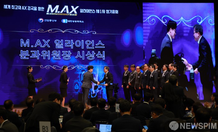 [서울=뉴스핌] 김학선 기자 = 김정관 산업통상자원부 장관이 24일 서울 중구 대한상공회의소 국제회의장에서 열린 M.AX 얼라이언스 제1차 정기총회에서 유공자 포상을 하고 있다. 2025.12.24 yooksa@newspim.com