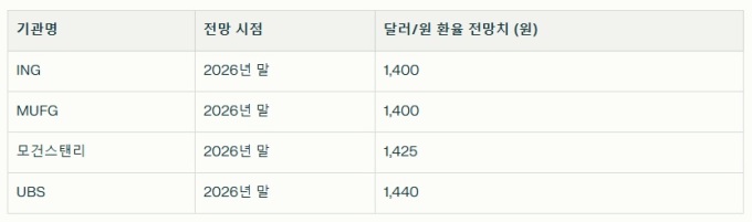 반면 원화를 압박했던 무역통상 부문의 불확실성이 가시고, 인공지능 등 핵심 기술 영역의 꾸준한 성장 사이클에 힘입어 원화는 반등할 것으로 기대됐다. ING와 MUFG는 내년말 달러/원 환율 전망치를 1400원으로 제시했다. 모간스탠리의 전망치는 1425원, UBS의 전망치는 1440원이다.